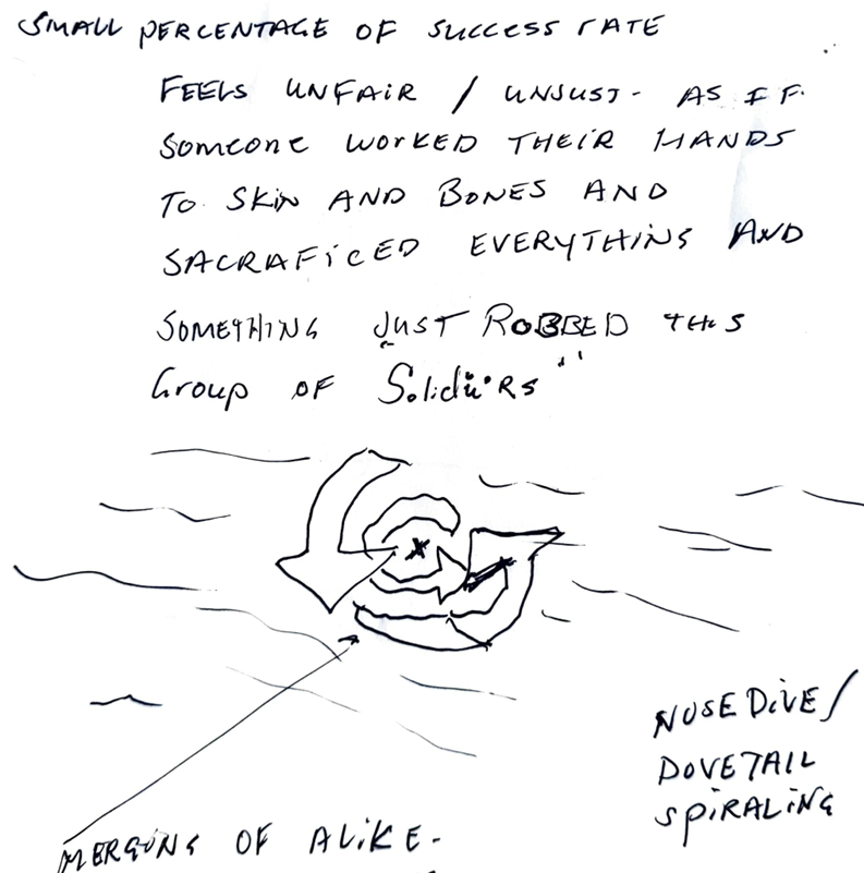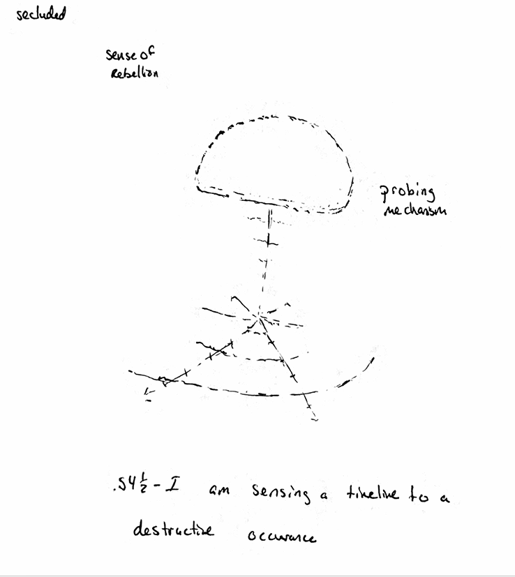 Charlie explicitly draws multiple objects that "never touch and perfectly and narrowly miss each other with precision." David has similar data while John draws a nose-dive/dovetail spiral. Patricia has oscillating falling/rising motion with circling around. All this may signal shipping traffic attempting to navigate a contested waterway, near-miss military incidents, precision weapons systems, or the economic volatility pattern of prices spiking and crashing.