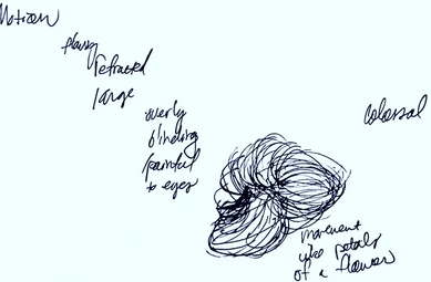 The initial drawings and impressions here seemed to paint the picture of subjects inhabiting a place, yet this place was notably different. The walls on the interior of the structure appeared layered, almost dripping. These gave the feeling of something rather psychedelic and not fully explainable. Some immediate impressions of someone at the site were listed and possibly a location. I had the impression of a spherical object being randomly encountered in an otherwise natural forest setting, which was eerie and probably metaphorical, in the way you would stumble upon an odd place in outer space.