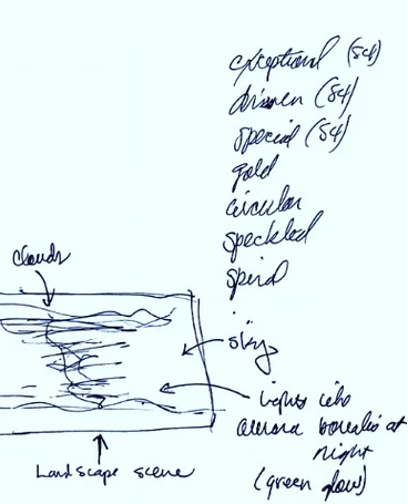Next, there are dynamics of opposing patterns of wind or flow. Then we see explosive energy emanating outward. The imagery I saw also involved the night sky cast against a natural landscape below: